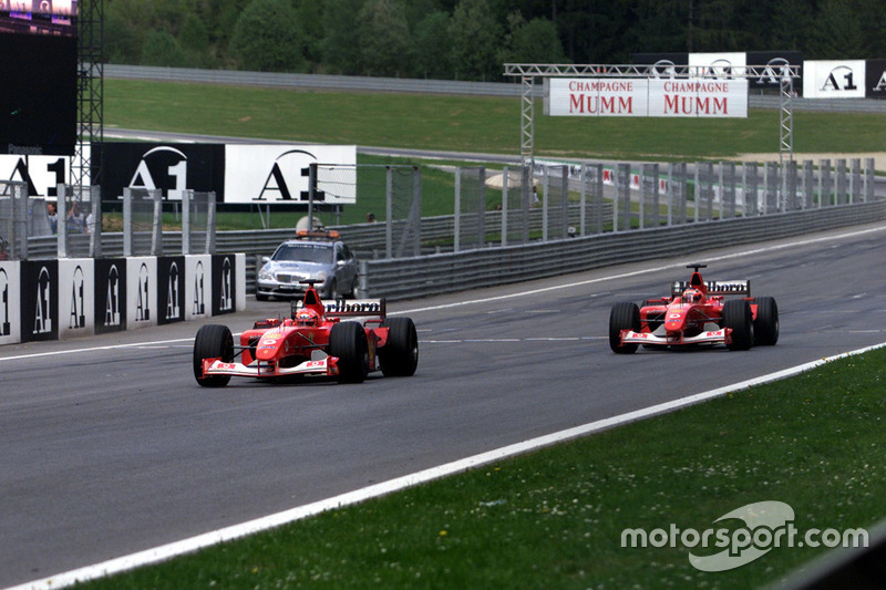 Com os quatro primeiros andando tão próximos, a corrida seria decida nos boxes. Schumacher foi o primeiro a parar, tentando dar o pulo do gato, mas o alemão só conseguiu ganhar a posição de Montoya, que logo cederia sua posição para Ralf. Ordem de equipe da Williams? Para azar do colombiano, seu motor BMW estava entregando a alma até estourar na volta 47. Após a parada, Ralf Schumacher perdeu rendimento dos pneus e ficou longe do seu irmão, que estava sempre a 1s de Coulthard. Após todo o problema em Zeltweg, Rubens Barrichello fazia uma corrida apática e na volta 42 ele tentou ultrapassagem para lá de otimista em cima de Kimi Raikkonen na freada da chicane do túnel, que fez o finlandês abandonar. Rubens foi punido pela batida e quando foi cumprir a punição, excedeu o limite de velocidade, terminando a corrida em sétimo, o que na época significava estar fora da zona de pontuação.